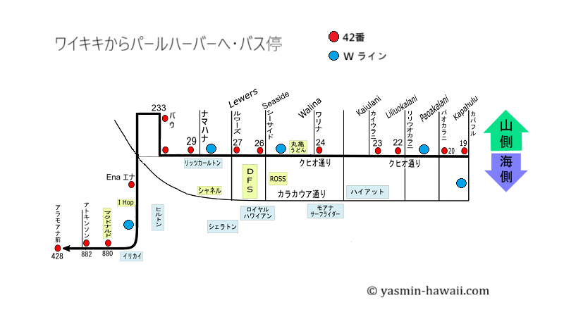 それと、滞在がホテルプリンセスカイウラニの辺りなのですが、アリゾナ記念館に行く場合には、バス停24番のKuhio Ave and Walina St前後くらいから42番、または20番に乗るという事で間違いないでしょうか?