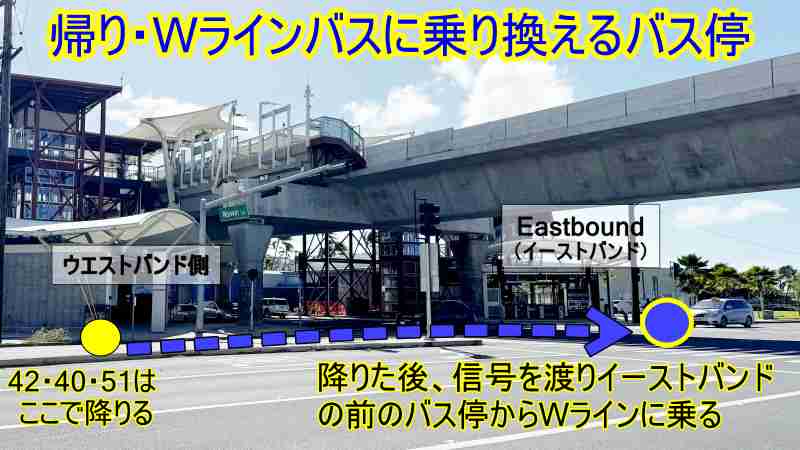 乗り換えなし42番のバスに乗った場合も、Wラインに乗って途中で乗り換えた場合も、降りるバス停は同じです。