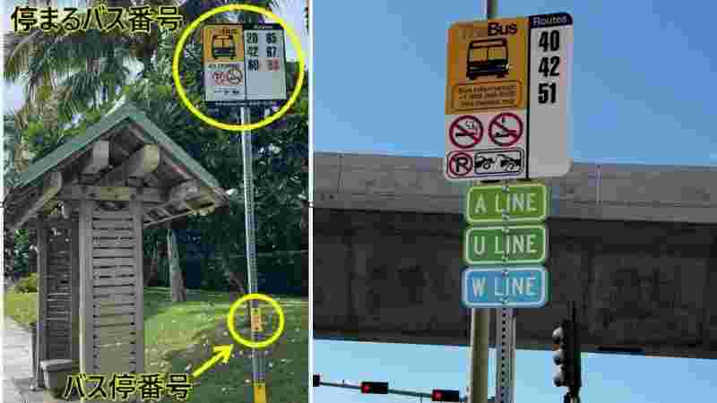 Kamehameha Hwy + Kalaloa(カメハメハ + カラロア)(図の青色の位置)は、42番・40番・51番のいずれのバスも停まります。
