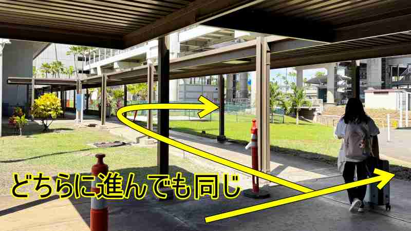 バス停の前は草が生えていていますので、キャスターのついたスーツケースは持ち上げて運ぶか、奥に進んで歩道を伝ってバスの列に並ぶとよいです。