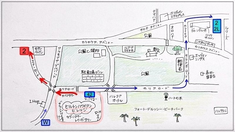 2Lに乗った場合の降りる「Kuhio・Lewers(クヒオ・ルアーズ)」のバス停は、この記事の最初にほうにある手描き地図の中の青色で「2・2L」と書いた所の向かい側に停まります。ここからヒルトンの方向に進みながら、広い公園の中の道を通って帰るとよいでしょう。
