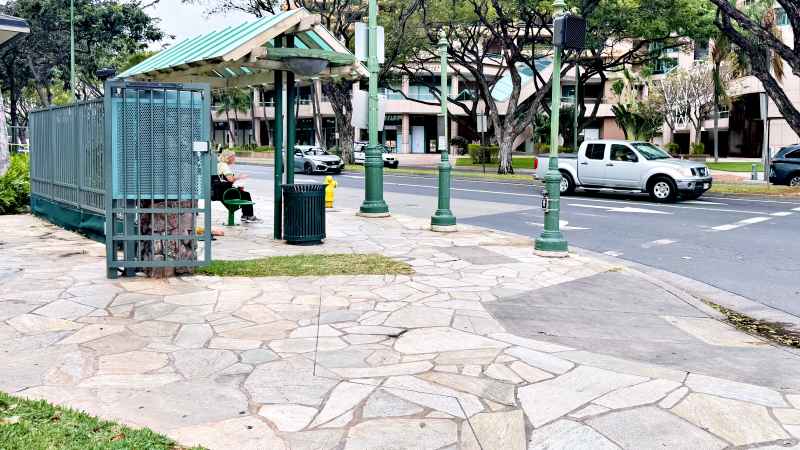 4分ほど歩くと、このようにカラカウア通りに面した左手にバス停が見えます。