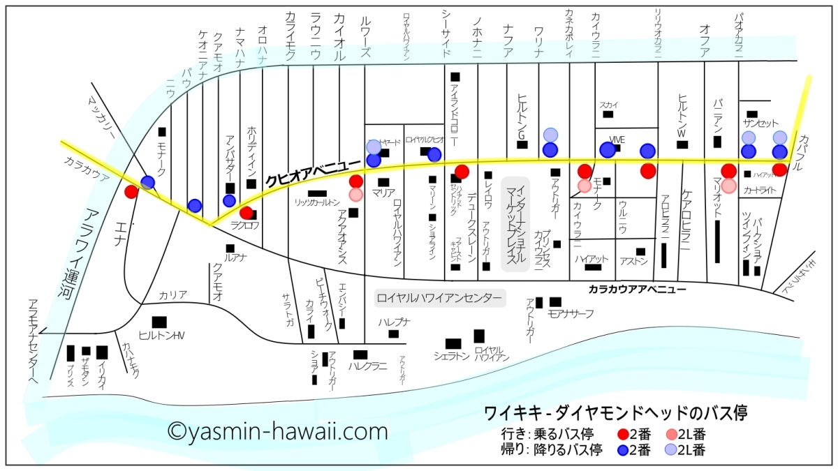 黄色い所が2番「ワイキキ-カピオラ二CC」に乗った時に降りるバス停です。