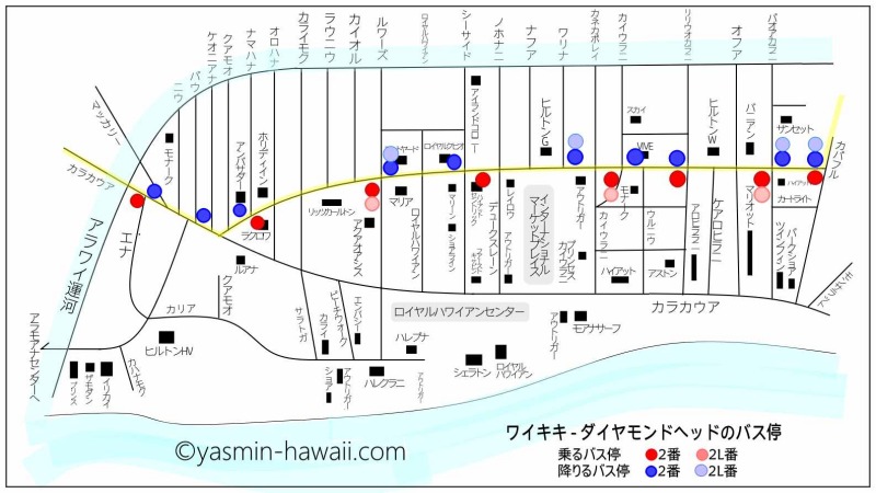 この記事の最初のほうにワイキキのバス停マップを載せていますが、その中の青い丸の位置が停まるバス停です。水色の丸の位置には2Lのバスも停まります。