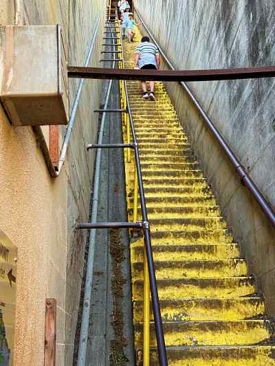 トンネルを抜けると右側に黄色の99段の階段があります。階段を上りたくない場合は、左側のコースを進みます。