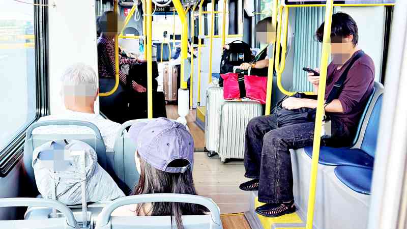 スーツケースが通路にはみ出すのは、バスが公表しているルールとは相反する部分はありますが、はみ出しつつも、みんなでシェアして乗っている、という感じです。