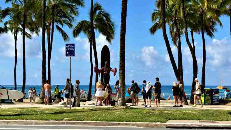 ハイアットの目の前はビーチとデューク・カハナモク像。テンション上がる風景です。