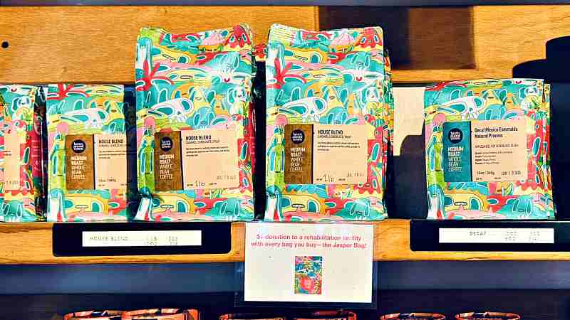カラフルなパッケージのハウスブレンド。1パウンド(453g)25ドル、12オンス(340g)18ドル。ディカフは12オンス(340g)20ドル、8オンス(340g)14ドル。