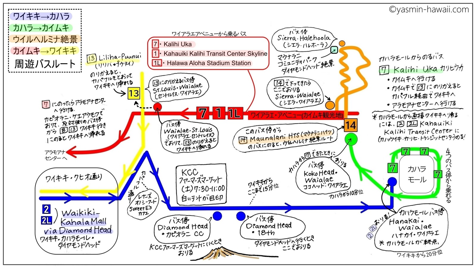 理由はワイキキから直接カイムキに行くのと、ワイキキからカハラモールを経由してカイムキ行へ行くのとあまり時間が変わらないからです。