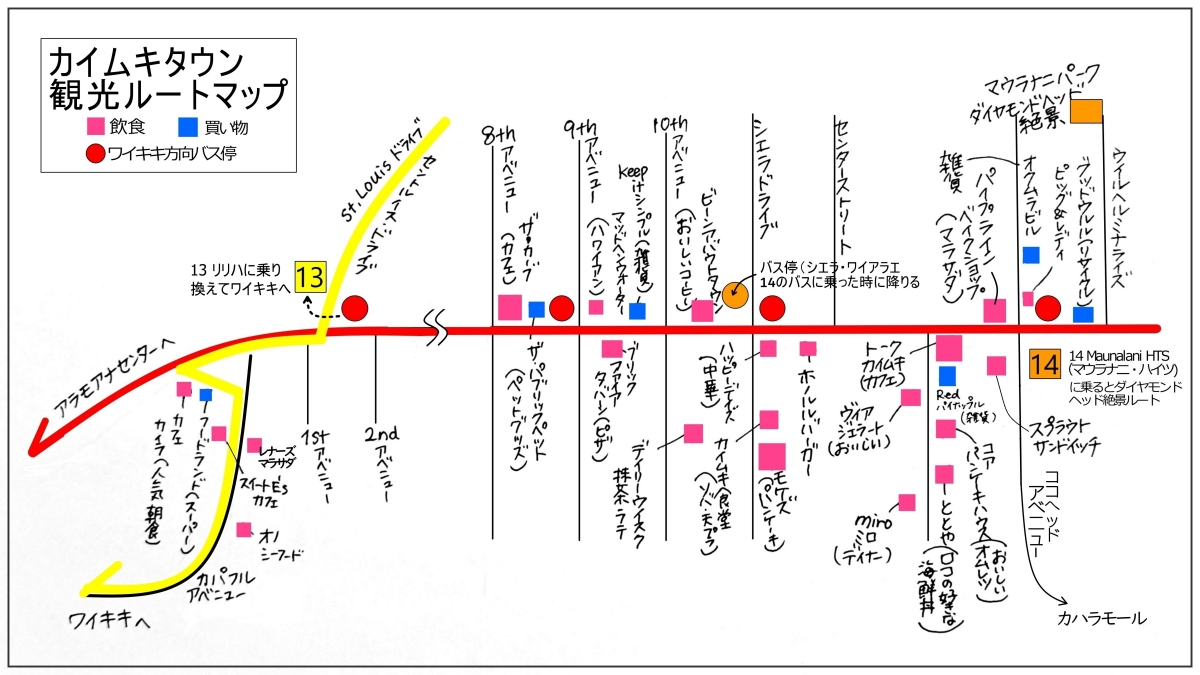カイムキの観光を終えてワイキキへ帰る場合は、1つ上のマップ(バス周遊ルート)の赤のラインから黄色のラインに乗り換えして帰ります。